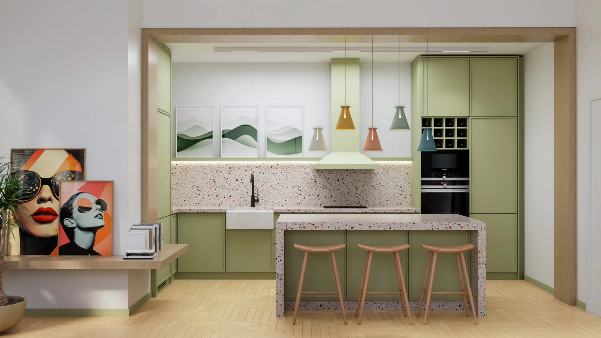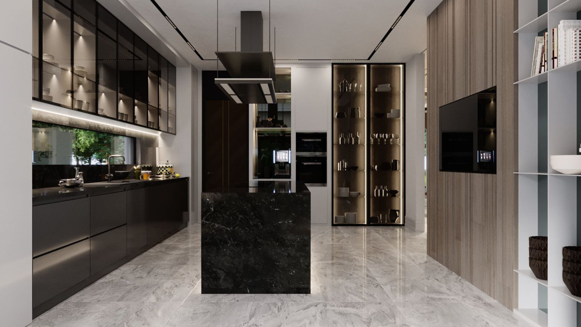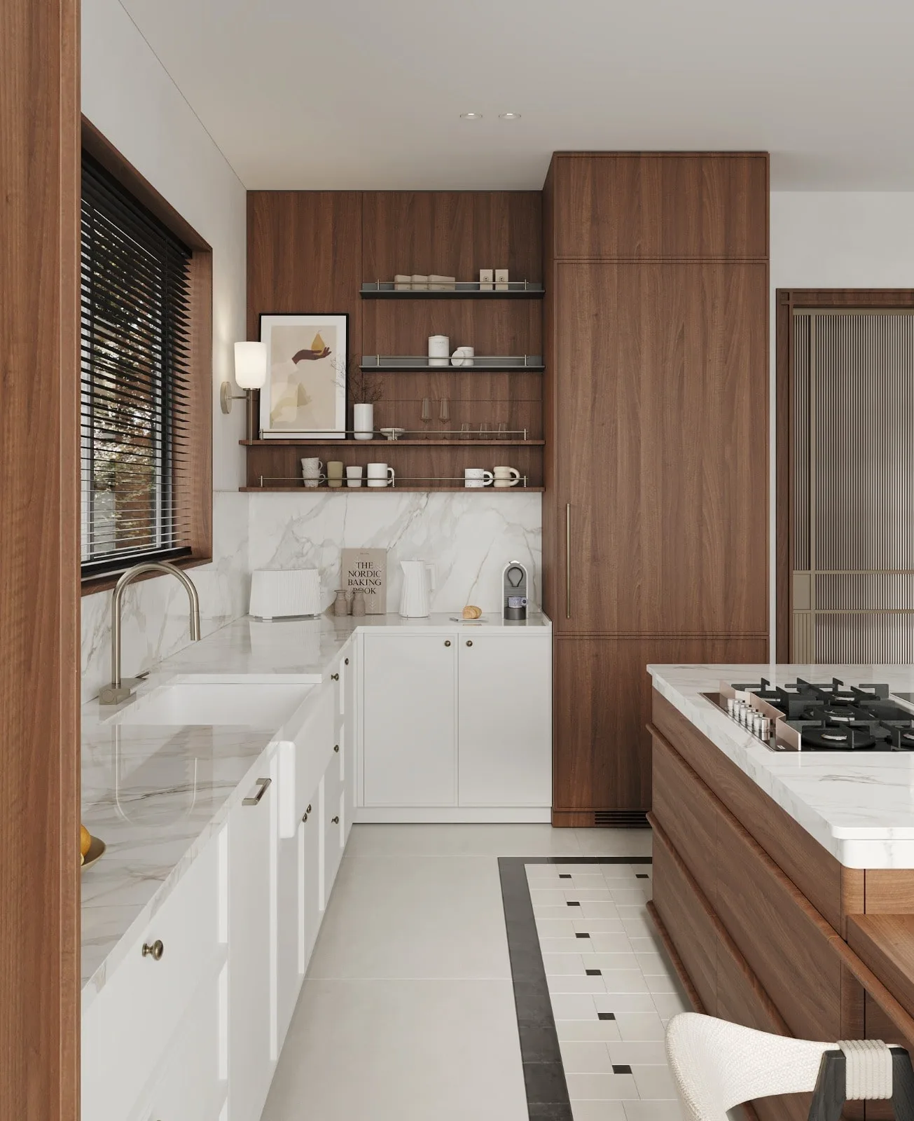acpartners-İç mimarlık-tasarım-mermer tezgâhlar, ceviz ahşap dolaplar ve mikrobeton zeminle tasarlanmış zamansız ama modern bir mutfak iç mekânı